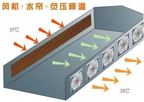1、“湿帘-负压风机”降温系统是由纸质多孔湿帘、水循环系统、风扇组成。未饱和的空气流经多孔、湿润的湿帘表面时,大量水分蒸发,空气中由温度体现的显热转化为蒸发潜热,从而降低空气自身的温度。风扇抽风时将经过湿帘降温的冷空气源源不断的引入室内,从而达到降温效果。